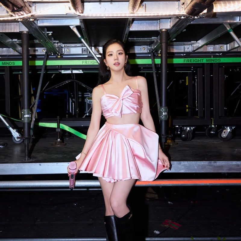 Trang phục custom đầu tiên mà Jonathan Anderson dành cho Jisoo ra mắt trong đêm diễn thứ 2 tại Los Angeles – Một set hai mảnh màu hồng phấn từ chất liệu satin óng ả. Áo điểm xuyết nơ và váy đắp vạt bất đối xứng tạo nên tổng thể lãng mạn, ngọt ngào và phảng phất nét tinh nghịch. Cô phối cùng bốt đen cùng thương hiệu, khiến giới mộ điệu không khỏi bàn tán về đãi ngộ lớn mà nhà mốt Pháp dành cho nữ ca sĩ, tin tưởng để cô trở thành người hé lộ sớm gu thẩm mỹ mới của Dior dưới thời Jonathan Anderson. jisoo concert deadline