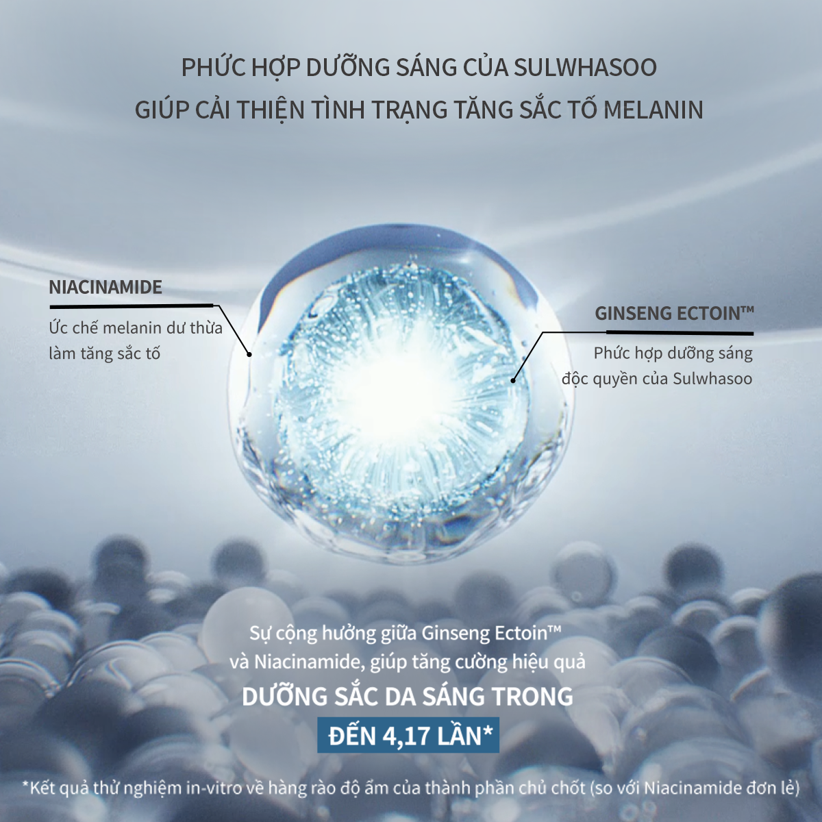 GINSENG ECTOIN™ – thành phần dưỡng sáng độc quyền của Sulwhasoo bao gồm hồng sâm, bạch sâm, Ectoin và Lymphanax™ , giúp làn da trở nên khỏe khoắn, ẩm mượt từ sâu bên trong từ đó kiểm soát sự sản sinh melanin quá mức. Sự cộng hưởng giữa NIACINAMIDE và GINSENG ECTOIN™ trong Tinh chất bạch sâm Lumiwise Brightening Ampoule Serum, giúp dưỡng sắc da sáng da trong đến 4,17 lần*, mang lại làm làn da khỏe, rạng rỡ.