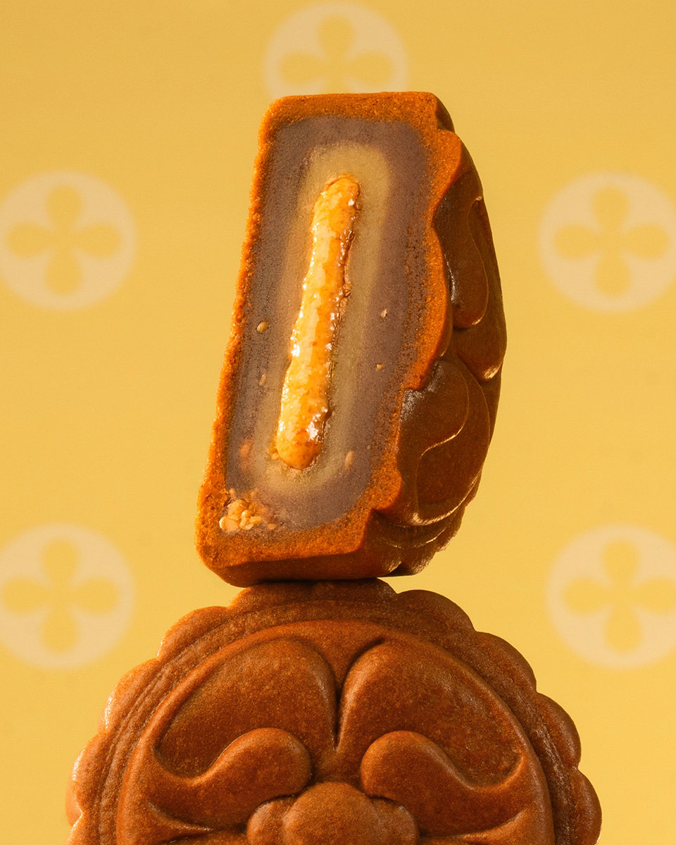 Thưởng thức BST “Tung Tăng Chơi Trăng”, đừng quên dừng lại bên chiếc bánh Trung thu mang vị bánh cam thuở nhỏ với nhân vàng óng như mật chín, bùi ngọt khoai môn, giòn tan vụn kẹo mè quyện cùng đậu xanh và thoảng ấm hương gừng. Ẩn sâu trong lớp nhân ấy là dòng sốt praline mè trắng và hạt điều béo ngậy, đem đến cảm giác “tưởng lạ mà quen” như lời thủ thỉ ngọt lành từ ký ức.