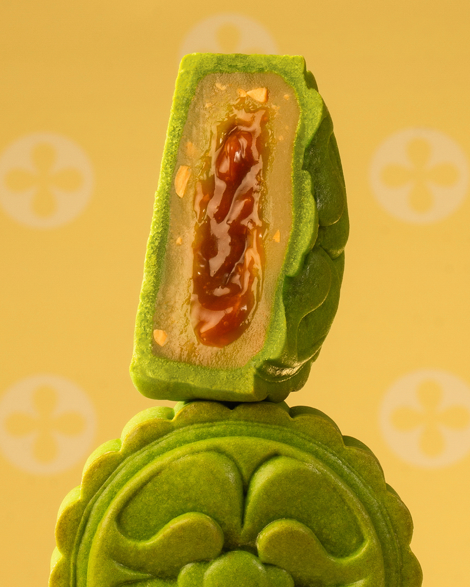 Bên cạnh đó, ký ức miền Tây lại trở về trong chiếc bánh Trung thu vị kẹo dừa với nhân lá dứa xanh mướt xen mứt dừa non trắng muốt, ôm lấy nhân sữa dừa béo bùi với đậu phộng rang vàng. Chính giữa bánh là sốt caramel dừa sóng sánh, để mỗi lần cắn vào là kỷ niệm về viên kẹo dừa Bến Tre ngày bé lại ùa về, ngọt ngào nơi đầu lưỡi.