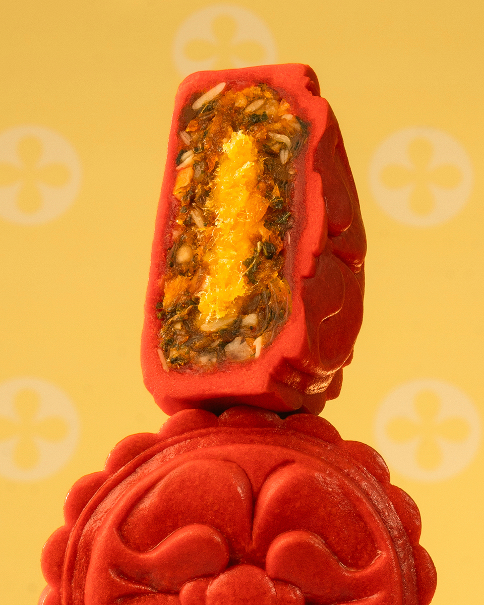 Dưới bàn tay khéo léo của những người thợ tài hoa, thức quà xưa cũ được Bakes khoác lên mình diện mạo mới vừa tinh tế vừa phá cách, như câu chuyện dân gian được kể lại bằng ngôn ngữ của hương vị hiện đại. Có ai không khỏi bất ngờ khi món bánh tráng trộn “huyền thoại” tuổi học trò nay lại thấm vị trong chiếc bánh Trung thu nhỏ xinh, mang chút cay, chút mặn, chút chua thân thuộc. Từng sợi khô bò, ruốc khô, xúc xích, da heo giòn, rau răm thơm, xoài sấy dẻo… hòa quyện thành bản hòa tấu ký ức với điểm nhấn là lớp sốt chà bông trứng muối béo mặn ở giữa, gợi về buổi tan trường ríu rít bên gánh hàng rong.