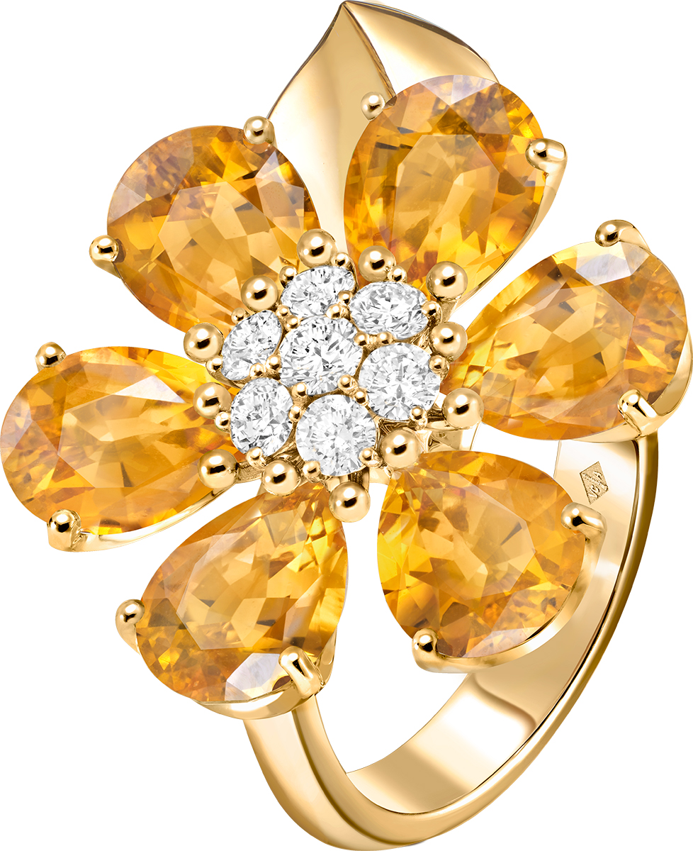 Phần khung đỡ bằng vàng được các nghệ nhân của Maison chế tác vô cùng công phu. Bằng kỹ thuật đúc sáp chảy, cấu trúc mở cho phép ánh sáng xuyên qua các viên đá và làm nổi bật màu sắc rực rỡ của chúng. Phần nhụy hoa được nâng lên một cách tinh tế, góp phần tạo nên cảm giác chuyển động cho tác phẩm. Bảy viên kim cương lấp lánh đồng điệu được bao quanh bởi các hạt vàng có độ tròn giống với phần chấu – thứ được những người thợ kim hoàn xử lý thủ công để đạt được hình dáng như quả cầu. Một chiếc lá vàng được đánh bóng, uốn cong nhẹ nhàng nhằm tạo nên độ dày cho thiết kế, đồng thời mang lại sự bất đối xứng đầy tính nghệ thuật.